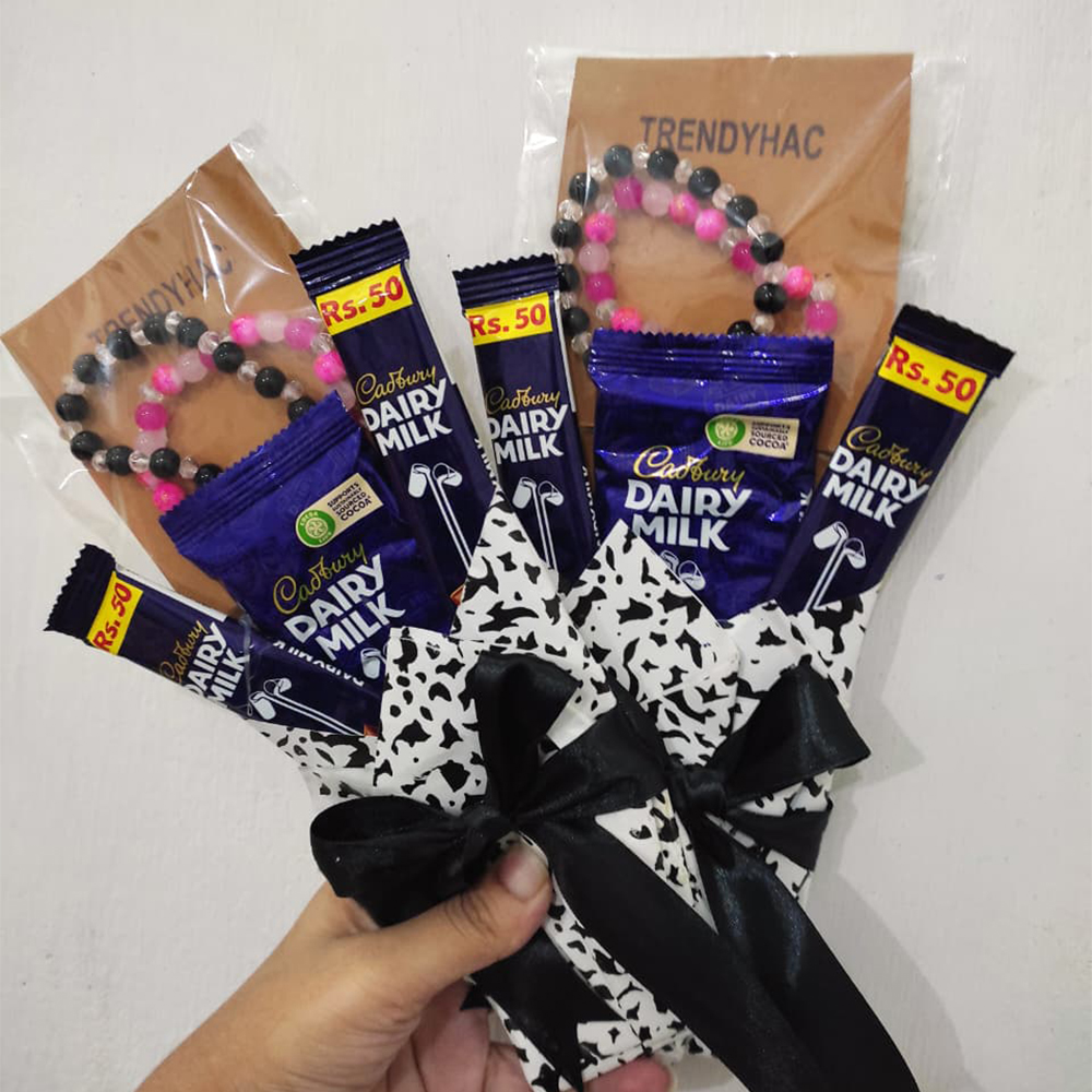 Mini Chocolate Gift with Handmade Bracelet Give a sweet gesture that speaks volumes! TrendyHac’s Chocolate Gift includes Dairy Milk bars and a stylish bracelet — elegantly wrapped for a simple yet meaningful surprise. Perfect for small celebrations, giveaways, or thoughtful gestures.